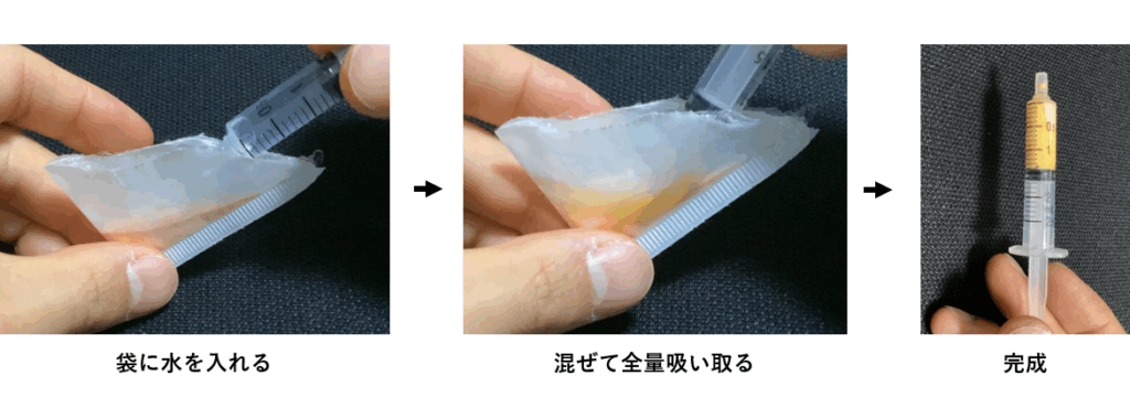 - 袋の中で薬を混ぜ、注射器につめる