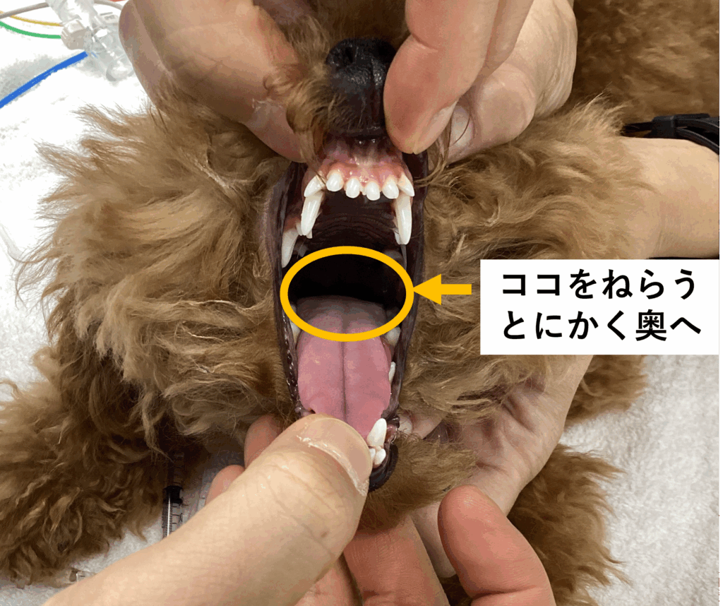 - 食事や水を飲ませる(食道に残らないように)。ご褒美になるようなおやつを与えるのもよい。